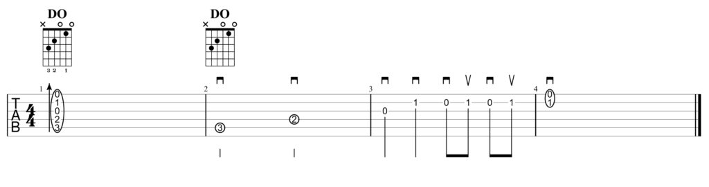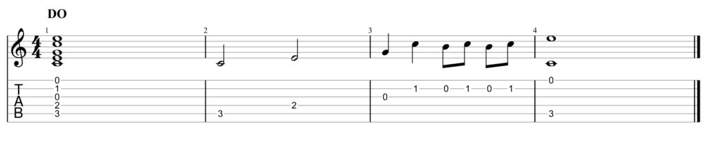 Les chiffres écrits sur ces cordes représentent les cases dans lesquelles se posent les doigts au cours du morceau. Bien souvent, ils se posent en groupe au début d’une mesure (main gauche) pour réaliser un accord complet que la main droite viendra égrener au fil de la mesure (et donc du temps) en arpège ou battement. Mesure 1, l’accord de DO est joué d’un seul coup (mais on ne joue pas la corde 6 car il n’y a pas de chiffre dessus). Mesures 2, 3, 4, l’accord de DO, posé complétement en début de mesure 2 à la main gauche est progressivement joué à la main droite. Mesure 2 : 5ème corde 3ème case puis 4ème corde 2ème case en blanches. Mesure 3 : 3ème corde à vide, 2ème corde 1ère case en noires.