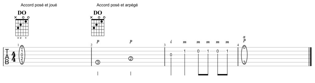 Les doigtés de la main droite, lorsqu’elle joue en arpège sans médiator (les notes plus ou moins les unes après les autres) sont indiqués par des lettres. Sauf exception, le pouce p joue les 3 basses (mi 6ème, la 5ème, ré 4ème corde) ; l’index i joue la 3ème corde (sol) ; le majeur m joue la seconde corde (si) ; l’annulaire a joue la 1ère corde.