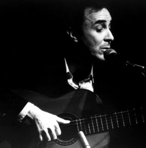 À droite, la main prête à faire des arpèges, est « bloquée » au niveau et au-dessus de la rosace, le poignet cassé et chaque doigt positionné à proximité de la corde qu’il doit jouer : la main ne bouge pas, ce sont les doigts qui se plient pour pincer les cordes.