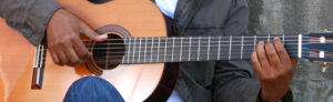 À gauche, pour réaliser le plus vite possible les accords demandés, le guitariste cherche à déplacer, lorsque c’est possible, des « blocs » où les doigts sont collés les uns aux autres. Par exemple, le Mim et le Lam (les deux premiers accords qu’on apprend généralement à passer en rythme), ont un « dessin » très voisin. Ils ont deux doigts communs, le majeur et l’annulaire que l’on va « coller » ensemble pour les déplacer en un seul mouvement d’une corde vers l’aigu ; arrivé au Lam, il suffira d’ajouter l’index sur la 2ème corde (si). Autre exemple : pour l’accord de La majeur, les 3 doigts sont dans la même case (la 2ème) sur 3 cordes qui se suivent (ré, sol, si) ; l’index, le majeur et l’annulaire formeront un bloc bien perpendiculaire posé simultanément sur les 3 cordes (4ème, 3ème, 2ème). Donc, au final, la leçon à bien retenir, c’est de toujours minimiser les mouvements…