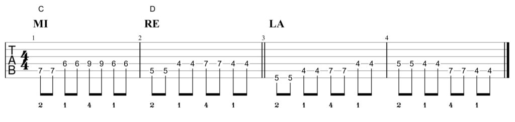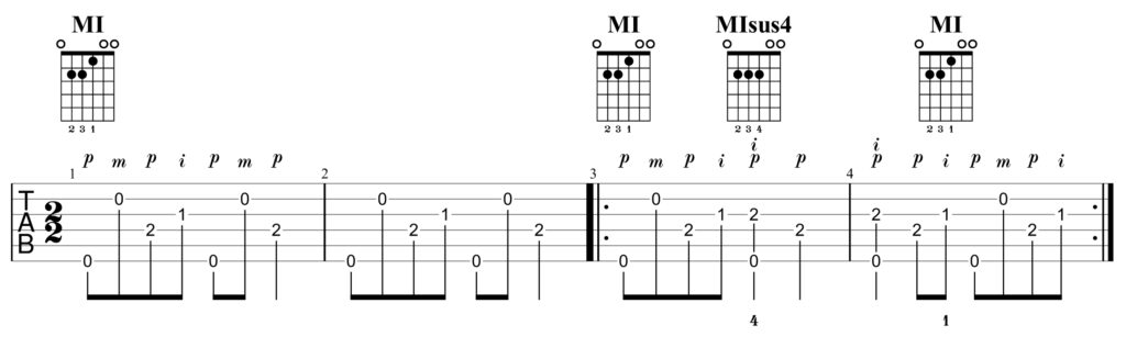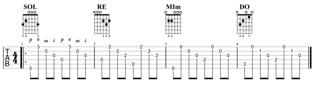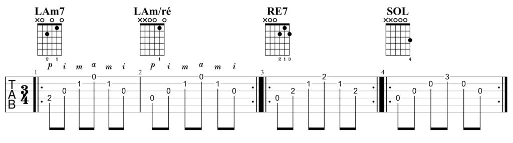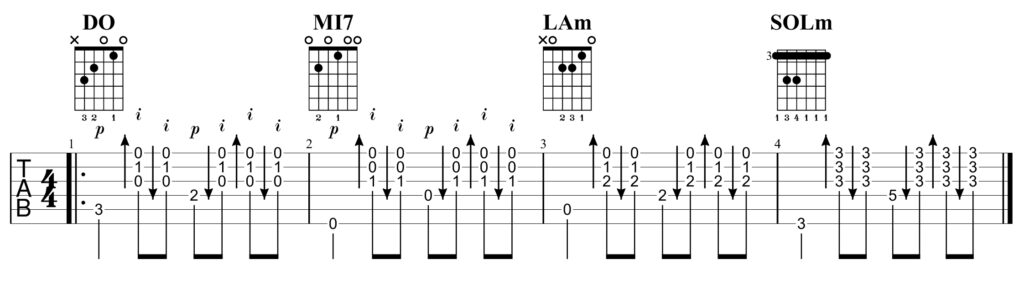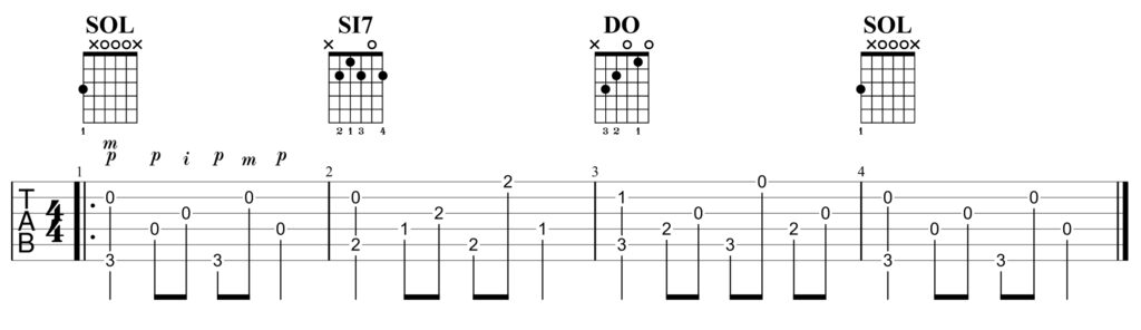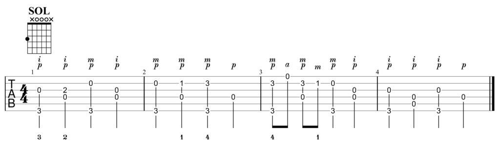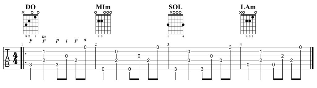 Commençons le travail de la main droite (pour les droitiers) et de la main gauche (pour les gauchers) par l’arpège certainement le plus efficace pour reproduire des mélodies à la guitare (guitare instrumentale dans un genre plutôt folk). Mais n’oubliez pas que cet arpège permet de s’accompagner très efficacement en reproduisant simplement le « principe » du picking sur chaque accord de la chanson que vous interprétez.