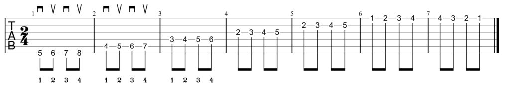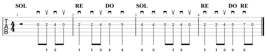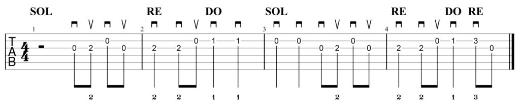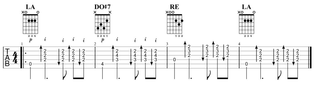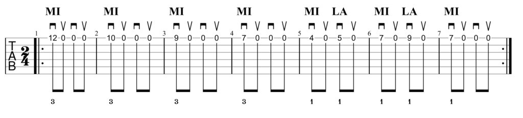 Nous avons choisi « J’ai du bon tabac » pour commencer pour que vous puissiez être aidé par la mélodie que vous connaissez. À la main droite, l’aller (П vers le bas) et le retour (V en remontant) correspondent à des croches et suivent le sens du pied : première croche vers le bas (aller П) en même temps que le pied tombe, deuxième croche vers le haut (retour V) en même temps que le pied remonte. Comme pour les battements, le sens des coups de médiator et les mouvements du pied se suivent