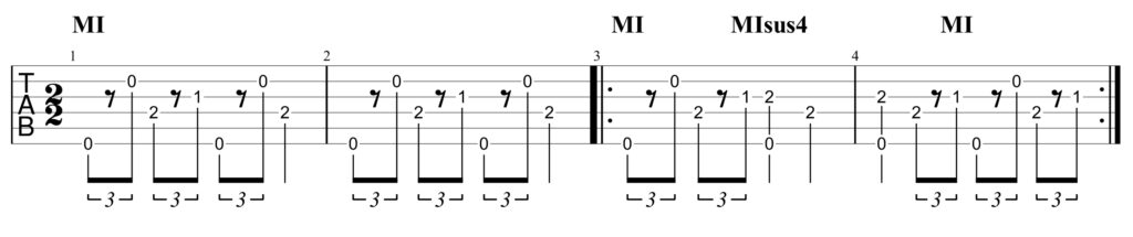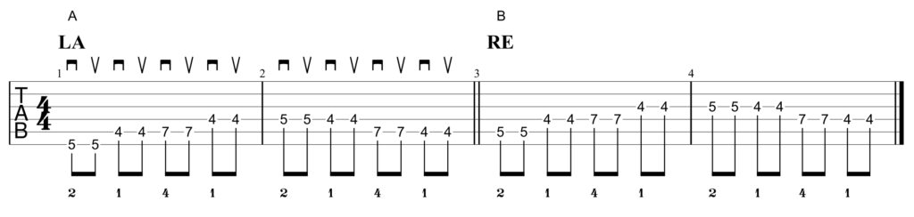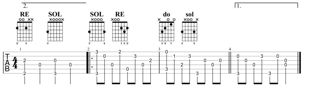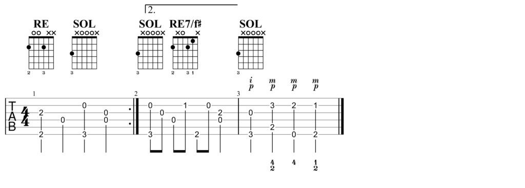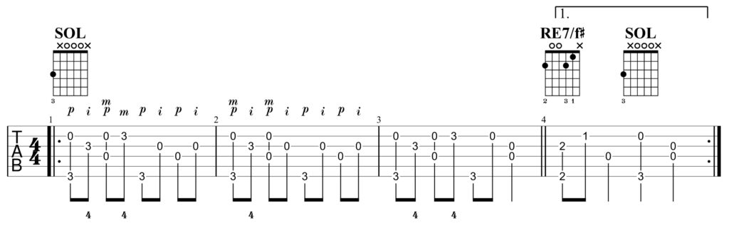 Le style « Hillbilly » est un bon exemple de morceau à la guitare où l’accompagnement (le battement folk, mesures 2 et 4) est alterné avec de courts passages reprenant la mélodie (mesures 1 et 3) jouée par le pouce : c’est l’inverse du picking !