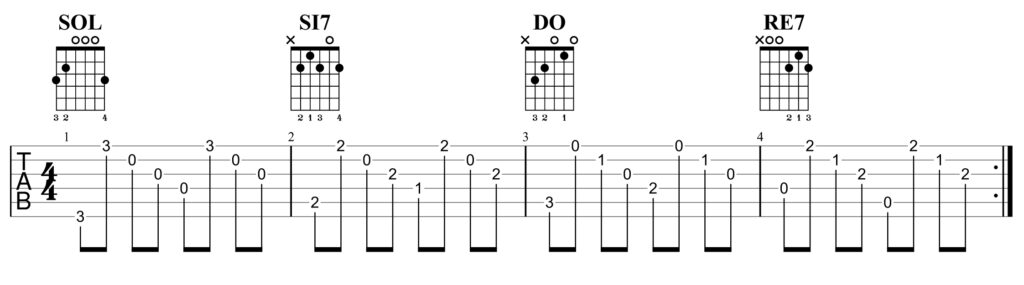 Il existe bien entendu d’autres modèles d’arpège. En voici sept exemples, toujours sur de petites suites d’accords simples vous permettant à la fois de jouer quelques petits trucs sympas à votre copain (ou à votre copine) et de travailler les passages d’accords. Pensez à toujours utiliser le pouce pour les 3 premières cordes (les basses), l’index pour la Sol (G), le majeur pour la SI (B) et l’annulaire pour la MI (E) chanterelle.