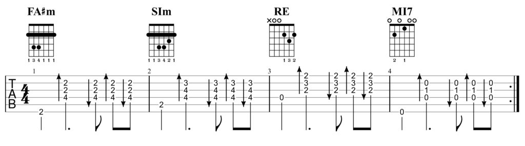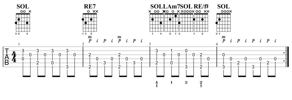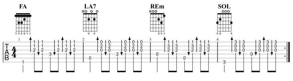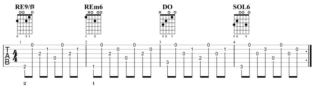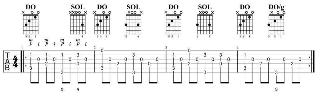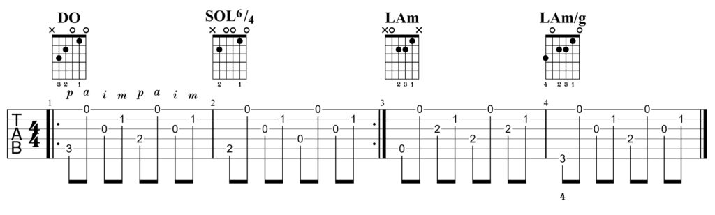Sur les deux premières mesures, on reconnait le gimmick (DO – SOL4 ou si l’on préfère DO – DO/b) qui a fait le succès de l’inoubliable « Je l’aime à mourir » de Francis Cabrel (1979). La suite, qui n’a rien à voir avec la ballade, permet de boucler la boucle en DO avec des variations sur les différents accords permettant de créer une descente mélodique de basses : la sol fa# fa.