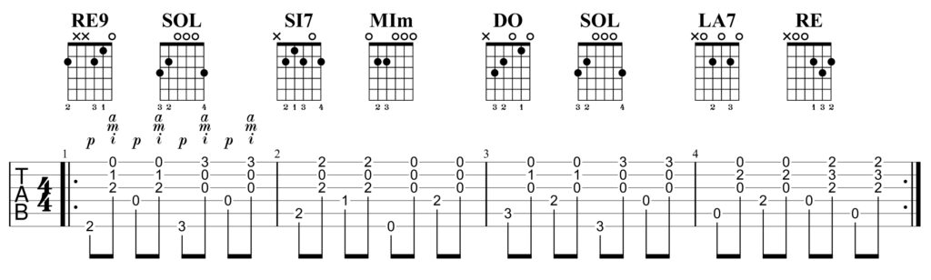 Revenons en France pour clore ce volet consacré aux arpèges réalisés aux doigts (de la main droite). Cet arpège est tellement révélateur du style de l’artiste qu’on l’a appelé « l’arpège Brassens » : une basse sur le temps alternée sur le contretemps par le groupe des 3 doigts, index majeur, annulaire.