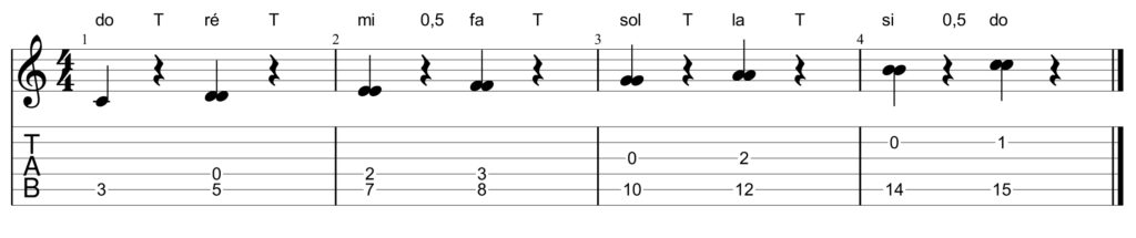 Dans la musique occidentale nous utilisons la gamme diatonique, dite gamme de Pythagore. Par rapport à l’échelle chromatique, elle n’a que 7 notes et pour cette raison est appelée gamme « heptatonique » (hepta = sept). La gamme diatonique majeure compte 5 tons et 2 demi-tons. Elle est caractérisée par sa note de départ (ici do) appelée tonique, et par la succession des intervalles suivants : Ton Ton Demi-ton Ton Ton Ton Demi-ton. Dans cette gamme majeure, les demi-tons sont donc placés entre le 3ème et le 4ème degré, et le 7ème et le 8ème degré. Il suffit donc de respecter cette règle pour construire les autres gammes majeures.