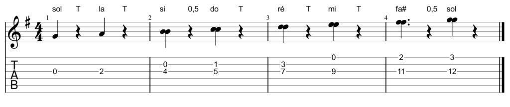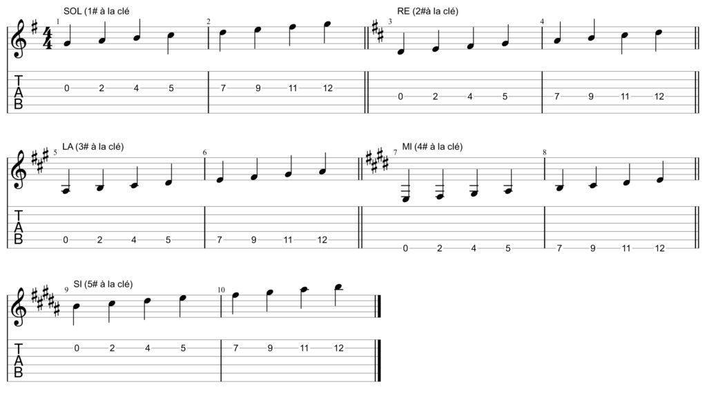 La gamme de SOL se reconnaît au fait de commencer par sol (sa tonique) et d’avoir une seule note altérée, le Fa#.
