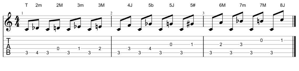Les principaux intervalles, à partir d’une tonique sont : la seconde mineure, la seconde majeure, la tierce mineure, la tierce majeure, la quarte juste, la quinte diminuée, la quinte juste, la quinte augmentée, la sixième mineure, la sixième majeure, la septième mineure, la septième majeure et l’octave juste.