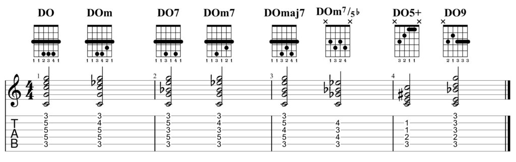 L’intervalle de quinte juste. Il n’est jamais mentionné dans le nom de l’accord. Pour DO c’est la note sol. Le nom de l’accord est DO. L’intervalle de tierce mineure (1 ton et demi). Pour DO c’est la note mib. Il est mentionné dans le nom de l’accord par un m minuscule qui suit le nom de la fondamentale. Le nom de l’accord est DOm. L’intervalle de tierce majeure (2 tons). Il n’est jamais mentionné dans le nom de l’accord. Pour DO c’est la note mi. Le nom de l’accord est DO. L’intervalle de septième mineure (5 tons). Pour DO c’est la note sib. Il est mentionné dans le nom de l’accord par un 7 qui suit le nom de la fondamentale. Le nom de l’accord est DO7. L’intervalle de septième majeure (5 tons et demi). Pour DO c’est la note si. Il est mentionné dans le nom de l’accord par un 7M (ou maj7) qui suit le nom de la fondamentale. Le nom de l’accord est DO7M.