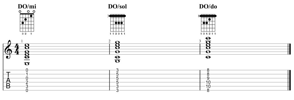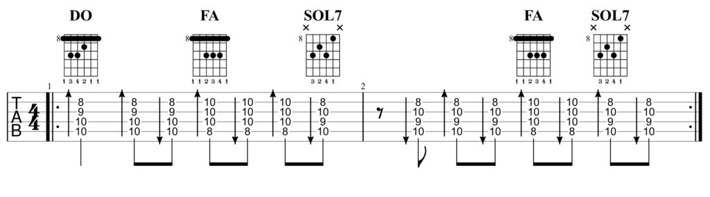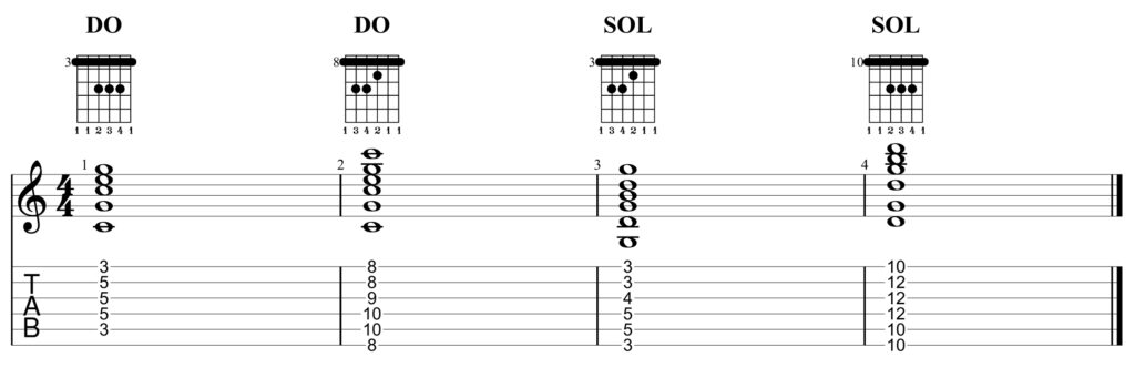 Chaque accord peut se réaliser à différents endroits du manche de la guitare et chaque nouvelle position peut s’appeller un « renversement ». Voyons cela avec DO (mesures 1 et 2), avec deux positions en barré, réalisées à la 3ème et à la 8ème case de la guitare. Et la même chose pour SOL (mesures 3 et 4), barrés à la case 3 et à la case 10.