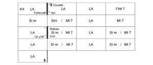 Le couplet (Il pleuvait fort) se joue deux fois (barres de reprise) avec un accord par mesure, 8 temps de LA (2 carreau), 4 temps de FA#7 (1 carreau), 4 temps de SIm (1 carreau). Ni les placements des paroles, ni le travail de la main droite ne sont indiqués. On sait juste quels sont les accords et quand en changer ; on comprend alors que la grille est surtout un outil apprécié par les musiciens, et dans le cadre de la chanson, par les accompagnateurs.