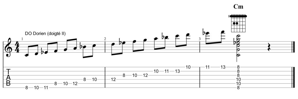 L’affaire est un peu compliquée… Pour en faciliter la compréhension, on pourrait dire que jouer en DO majeur (do ré mi fa sol la si) sur un accord de RÉm revient à jouer notre doigté II et, comme nous allons le voir, en RÉ dorien. Pour ceux qui ont toujours un peu de mal à saisir, on peut également proposer l’interprétation suivante : utiliser le doigté II en le commençant par la note ré, c’est jouer en RÉ dorien. Et, par extension, utiliser ce doigté II en le commençant par la note do, c’est jouer en DO dorien.