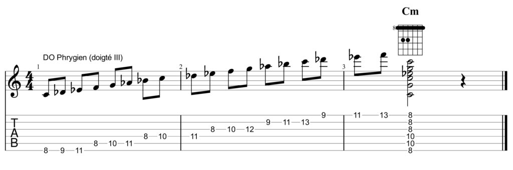 C’est aussi une gamme mineure, mais très typée car cette fois tous ses intervalles sont mineurs (II, III, VI, VII) ou justes (IV, V). En particulier, sa seconde mineure (réb) lui confère une sonorité « espagnole » ou « orientale ». Ce mode correspond également à un accord mineur (mib = 3m) ou mineur 7, Dom ou Dom7. Si l’on ajoutait une cinquième note dans l’accord, ce serait une seconde mineure et l’accord s’appelerait alors Mim9m. En fait, jouer en DO phrygien revient à jouer en LAb majeur (4b à la clé) sur un accord de DOm. C’est un mode qui était fréquemment utilisé par le guitariste flamenco Paco de Lucia