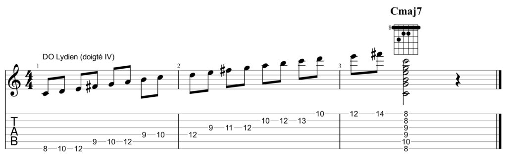 C’est une gamme majeure qui fonctionne bien sur les accords majeurs 7M (si = 7M). Elle tient son originalité de sa quarte augmentée (fa#) qui lui donne une couleur très caractéristique. Ce mode correspond à un accord majeur (mi = 3M) ou majeur 7M, DO ou DO7M. En fait, jouer en DO lydien revient à jouer en SOL majeur (1 # à la clé) sur un accord de DO. Le compositeur Gabriel Fauré l’a, entre autres, utilisé dans un morceau très justement intitulé « Lydia ».