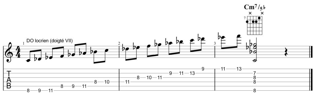 C’est une gamme mineure (mib = 3m) moins utilisée en raison de sa quinte diminuée (solb). Néanmoins, elle sert à jouer sur ces accords particuliers que sont les mineurs septième quinte diminuée. Ce mode correspond donc à un accord mineur/5b ou mineur7m/5b, DOm/5b ou DOm7/5b. En fait, jouer en DO locrien revient à jouer en RÉb majeur (5 b à la clé) sur un accord de DO. Il faut bien avouer que peu de musiciens se sont lancés dans ce genre « déliquat » qu’est le locrien : il faut d’autant plus féliciter Sergeï Rachmaninov pour l’avoir fait dans son « Prélude en Si mineur » !