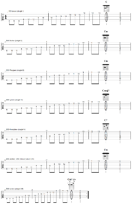 C’est aussi une gamme mineure, mais très typée car cette fois tous ses intervalles sont mineurs (II, III, VI, VII) ou justes (IV, V). En particulier, sa seconde mineure (réb) lui confère une sonorité « espagnole » ou « orientale ». Ce mode correspond également à un accord mineur (mib = 3m) ou mineur 7, Dom ou Dom7. Si l’on ajoutait une cinquième note dans l’accord, ce serait une seconde mineure et l’accord s’appelerait alors Mim9m. En fait, jouer en DO phrygien revient à jouer en LAb majeur (4b à la clé) sur un accord de DOm. C’est un mode qui était fréquemment utilisé par le guitariste flamenco Paco de Lucia