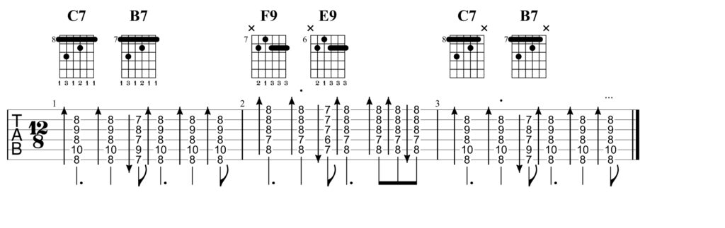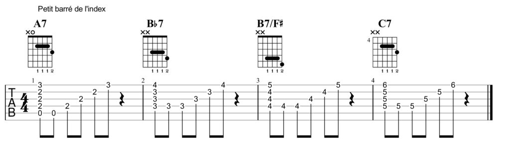 Par exemple, une des positions les plus connues concerne un des renversements de l’accord de LA7. C’est encore un barré de l’index, mais sur les 4 cordes aiguës à la 2ème case, auquel s’ajoute le majeur sur la corde de mi aigu à la 3ème case. À vide, il se joue sur les 6 cordes : mi (Vj) la (I) mi (Vj) la (I) do# (3M) sol (7m). Décalé sur le manche case après case (LA7, SIb7, SI7, DO7…), il ne sera plus joué que sur les 4 cordes aiguës.