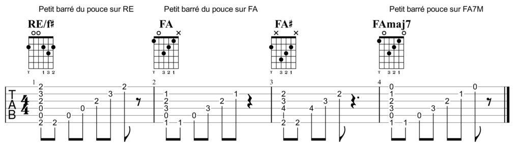 Les « barrés du pouce » peuvent être nécessaires dans certains morceaux. Il ne s’agit pas d’un barré à proprement parler puisqu’une seule corde est appuyée, mais par le pouce qui, en se pliant, remonte sur le devant de la touche pour toujours bloquer la corde de mi grave dans une case ou dans une autre. C’est principalement le cas pour deux accords : l’accord de RÉ majeur où le pouce placé à la 2ème case amène une tierce majeure (fa#) à la place d’un mi (à vide) qui est faux dans l’accord ; l’accord de FA ou de FA7M où, pour laisser des cordes à vide (le la grave ou le mi aigu), on préfère ce barré du pouce à la 1ère case au grand barré de l’index également à la case 1. Avec un peu d’habitude, on y arrive même si la position de la main gauche n’est pas très académique. On y arrive d’autant mieux qu’on joue sur une guitare folk, une électro-acoustique ou une guitare électrique dont les manches sont plus étroits que ceux des guitares classiques.
