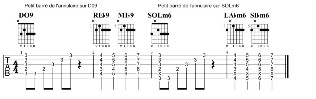 Les « barrés de l’annulaire ». Ce sont certainement les plus délicats à réaliser lorsqu’on décide de s’y mettre… L’annulaire doit alors « barrer » les 3 ou 4 dernières cordes de la guitare (les plus aiguës). Comme il faut ajouter des notes dans les basses pour jouer sur tout le manche, ce malheureux doigt (l’annulaire) doit donc un peu se plier, mais « à l’envers » (disons dans le sens inverse de l’articulation). De la torture !