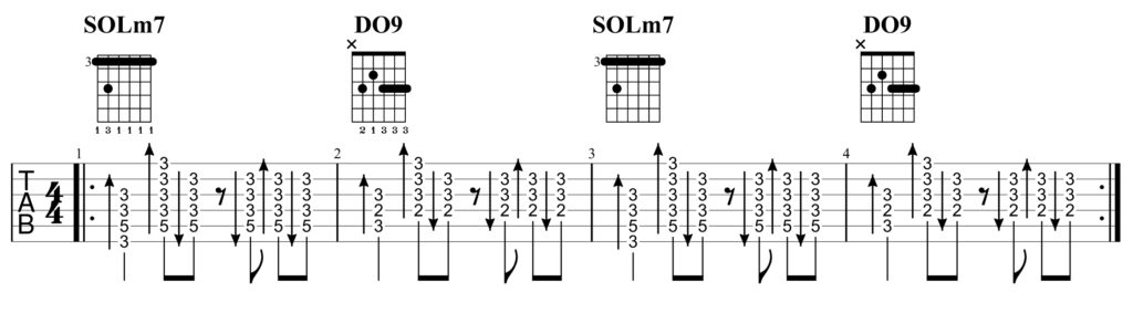 La première déduction, c’est que sur le renversement de DO9 présenté ci-dessus (à la case 3), il suffit de monter le doigt de basse (majeur) de do (corde 5, case 3) à sol (corde 6, case 3) pour passer de DO9 à SOLm6 (qui est aussi un DO9 sans fondamentale). La seconde déduction, c’est que le DO9 peut facilement se jouer avec le SOLm7, voire le remplacer. D’où la séquence très utilisée du IIm7 V9 exploitée dans nombre morceaux. Exemple : en SOL = LAm7 RÉ9 ; en FA = SOlm7 DO9…