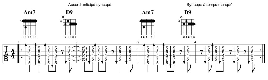 On appelle syncope une note ou un accord attaqués sur un temps faible (comme ici le 4ème contretemps) et prolongés sur le temps suivant qui est toujours un temps fort. Dit autrement, notre RÉ9 est ici une noire placée « en l’air », jouée sur la 2ème croche du 4ème temps (de la première mesure) et qui se poursuit sur la première croche du temps suivant. On peut également accentuer cet effet en bloquant la résonance sur le temps fort occupé alors par une figure de silence (demi-soupir) : c’est la « syncope à temps manqué » (missed beat syncopation).