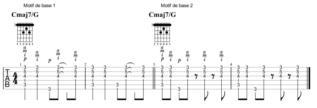 Sur des accords septièmes majeurs mis à l’honneur (SOL7M et DO7M), voici une variation typique du genre, avec anticipation d’accord entre la première et la seconde mesure. On reconnaîtra au passage un petit « arrière-goût » de la célèbre « Samba da bençao » de Baden Powell et Vinicius de Moraes.