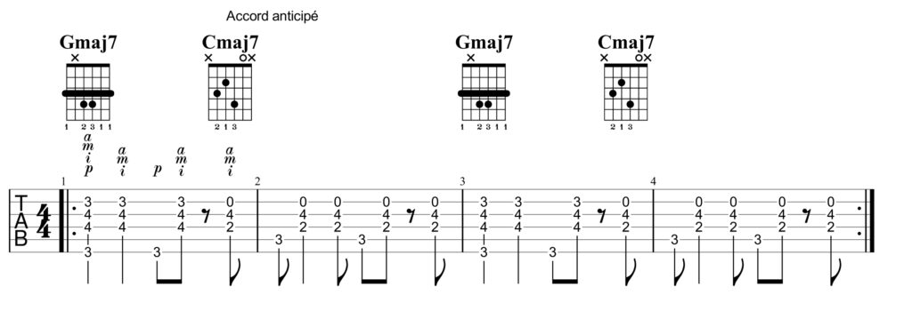 L’anticipation des accords, dans une rythmique, nous vient, entre autres, des musiques sud-américaines. Elle a été très utilisée dans le jazz, la bossa-nova, mais depuis peut également trouver sa place dans une tradition plus folk (Dick Annegarn…) ou plus pop… Les accords anticipés, c’est-à-dire joués avant leur place habituelle, sont souvent utilisés pour donner plus de « peps » à une cadence ; en fait, ils arrivent là où l’oreille ne les attend pas et créent une « surprise » rythmique. Prenons quelques exemples.
