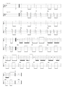 En mettant un capo en case 1 (un demi-ton plus haut), on peut jouer le tout en sol (Lab – 0,5 ton) et l’on obtient le même résultat, ce que nous avons proposé dans la tablature :