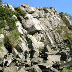 Avant de quitter Andaines pour Écouves, permettons-nous un dernier arrêt, bien qu’il ne s’agisse pas d’une cluse ; bien qu’on ne soit d’ailleurs plus dans les bois, mais dans un bocage aux marges de la forêt de la Motte, cet appendice oriental d’Andaines ; bien qu’on ait quitté le département de l’Orne pour une minuscule enclave de celui de la Mayenne perdue au nord, en territoire normand ! Mais nous sommes toujours dans les grès armoricains et, qui plus est sur le flanc septentrional du synclinal de Bagnoles, cas assez rare pour qu’on s’y intéresse. Situées à 3 km du bourg de Lignières-Orgères (sur la D 292 en direction de Magny-le-Désert) et visibles de la route (sur la droite), les Roches d’Orgères dominent, à 289 mètres d’altitude, le massif granitique de La Ferté-Macé situé au nord. L’érosion différentielle est à l’origine de la mise en relief de ces grès résistants constituant aujourd’hui une curiosité géologique d’une quarantaine de mètres de longueur sur une dizaine de hauteur.