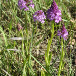 C’est certainement l’orchidée sauvage la plus commune sur les talus bocagers, les bermes des petites routes. Cette plante totalement hermaphrodite (dotée des caractères sexuels mâle et femelle) doit son nom usurpé à ses deux « tubercules » souterrains : orchis en grec = testicules ! Les fleurs sont pourpres, parfois roses ou blanches et l’orchis mâle est bien reconnaissable à ses feuilles tachetées de points sombres. Surnommée « Pentecôte » pour sa floraison étalée autour de la fête chrétienne (à partir de la mi-mai), cette orchidée apparaît de plus en plus tôt : dans le bocage normand, des pieds étaient fleuris le 10 avril !
